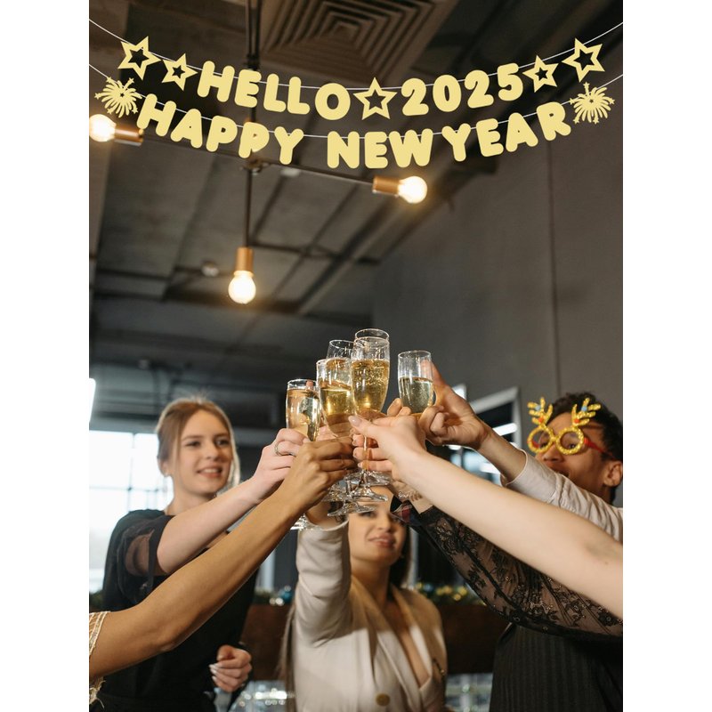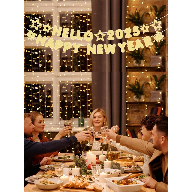 - Elegant Gold Glitter Design: Featuring a sparkling "Hello 2025" theme, this eye-catching banner adds a touch of sophistication and celebration to your New Year’s Eve party. Perfect for creating a festive and joyful atmosphere.