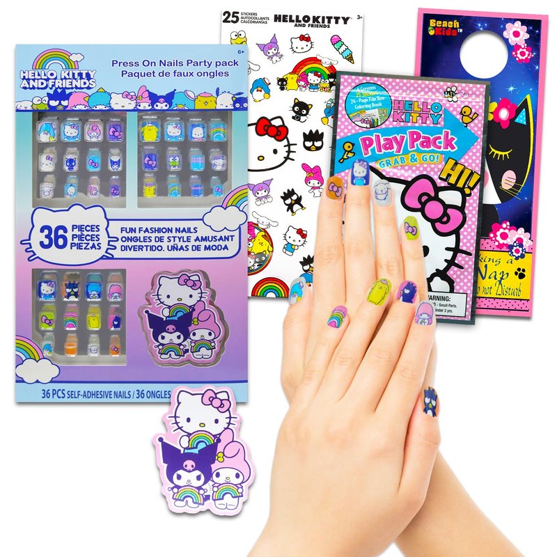 - Officially licensed Sanrio Hello Kitty nail activity set for kids of all ages also comes with Hello Kitty stickers, a Hello Kitty Play Pack, and a Beach Kids cat door hanger.