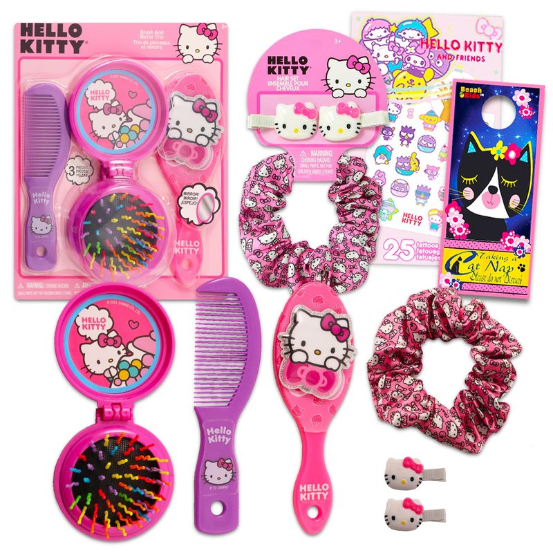 Hello Kitty Hair Accessories Set - Bundle with Hello Kitty Hair Scrunchies, Mirror, Hair Brush, Tattoos, and More | Hello Kitty Accessories for Girls. This Hello Kitty accessories set contains 1 hair scrunchie, 2 hair clips, 1 hair brush, 1 comb, and 1 mirror, each featuring colorful artwork of Hello Kitty in fun different designs. Styles may vary. Great for all fans of Hello Kitty, this hair accessories set is great to use as party favors, goodie bag fillers, stocking stuffers, part of a gift basket, and more. Sure to be a hit with Hello Kitty fans of all ages, these Hello Kitty hair and dress up accessories will make a great addition to any dress up parties and the assorted styles will allow for endless combinations of fun looks! Officially licensed Hello Kitty accessories for toddlers also includes bonus Hello Kitty temporary tattoos and a Beach Kids cat door hanger.