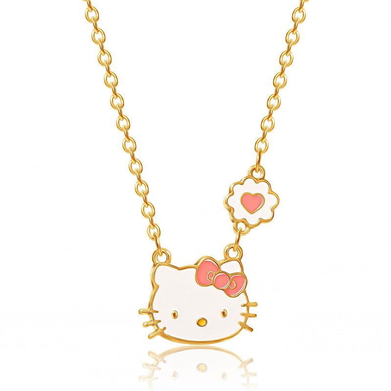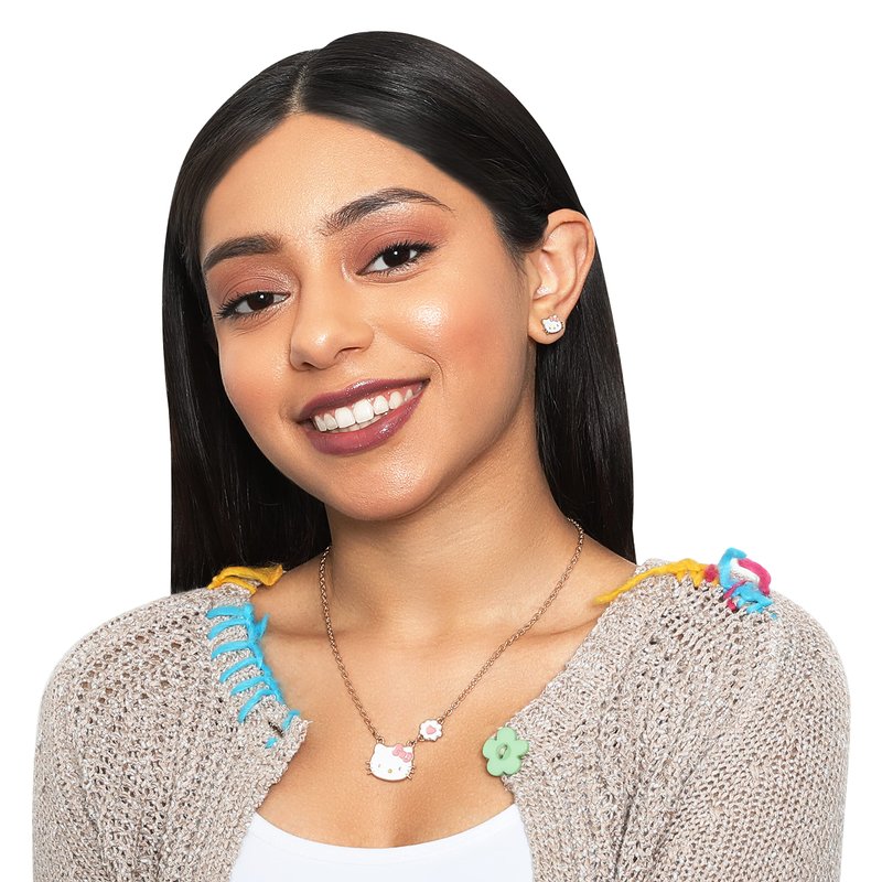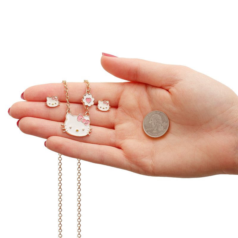 - Cute and classic Hello Kitty jewelry for girls that they can happily wear every day. This matching necklace and stud earrings set features the sweet face of Hello Kitty with enamel plating and pink bows for pops of color