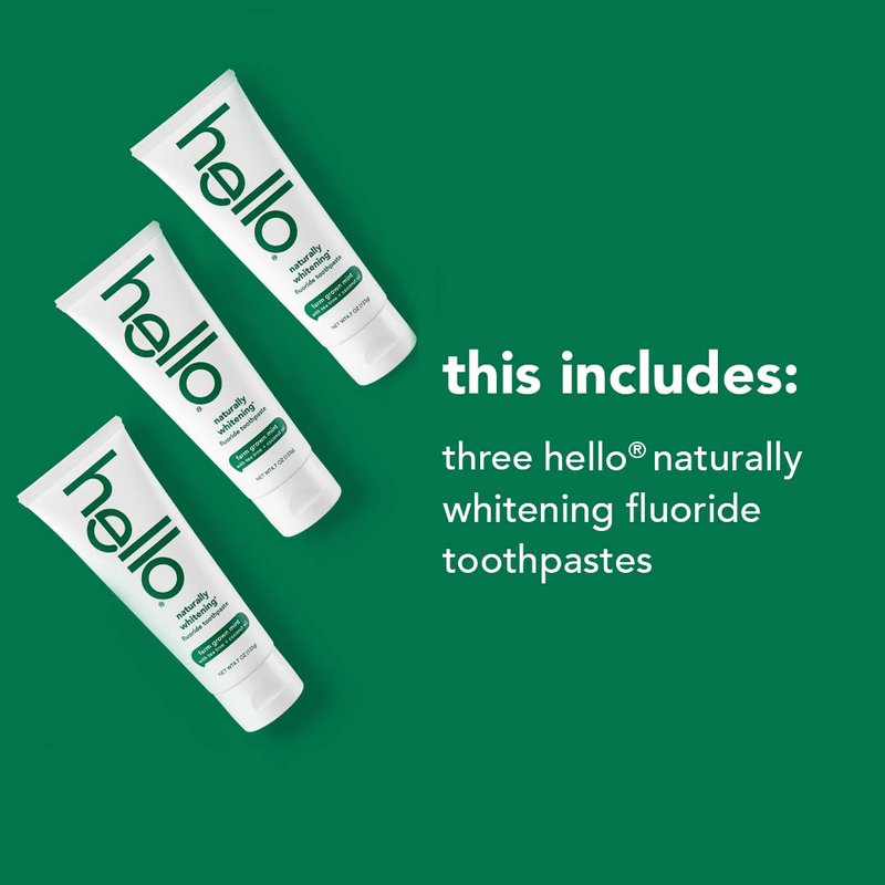 - Contains three (3) 4.7 oz. tubes of hello naturally whitening fluoride toothpaste