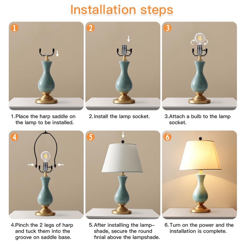 - Installation Guide - Please check the fourth picture. After installing the lamp on the saddle base, pinch the 2 legs of harp and tuck them into the groove on saddle base; the metal caps on two legs prevent the lamp from falling off and the lamp finial holds the lampshade in place.