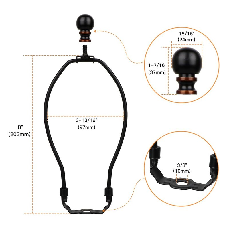 - Specification - Includes 2 sets of lamp harp and installation instructions. Overall total height: lampshade harp holder 8 inch (20cm) + Finial 1.37 inch (3.7cm), width: 3.8 inch (9.7cm), bottom saddle opening diameter: 3/8 inch (1cm). This lamp harp is suitable for most of the table / floor light lampshade on the market. Please pay attention to the third picture and make sure your lamp fits the size indicated before purchasing.