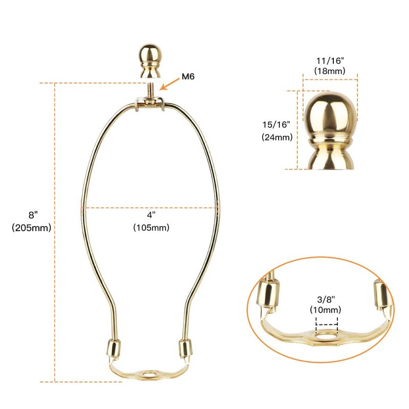 - Specification - Includes 2 sets of lamp harp and installation instructions. Overall total height: lampshade harp holder 8 inch (20cm) + Finial 0.95 inch (2.4cm), width: 4 inch (10.5cm), bottom saddle opening diameter: 3/8 inch (1cm). This lamp harp is suitable for most of the table / floor light lampshade on the market. Please pay attention to the third picture and make sure your lamp fits the size indicated before purchasing.