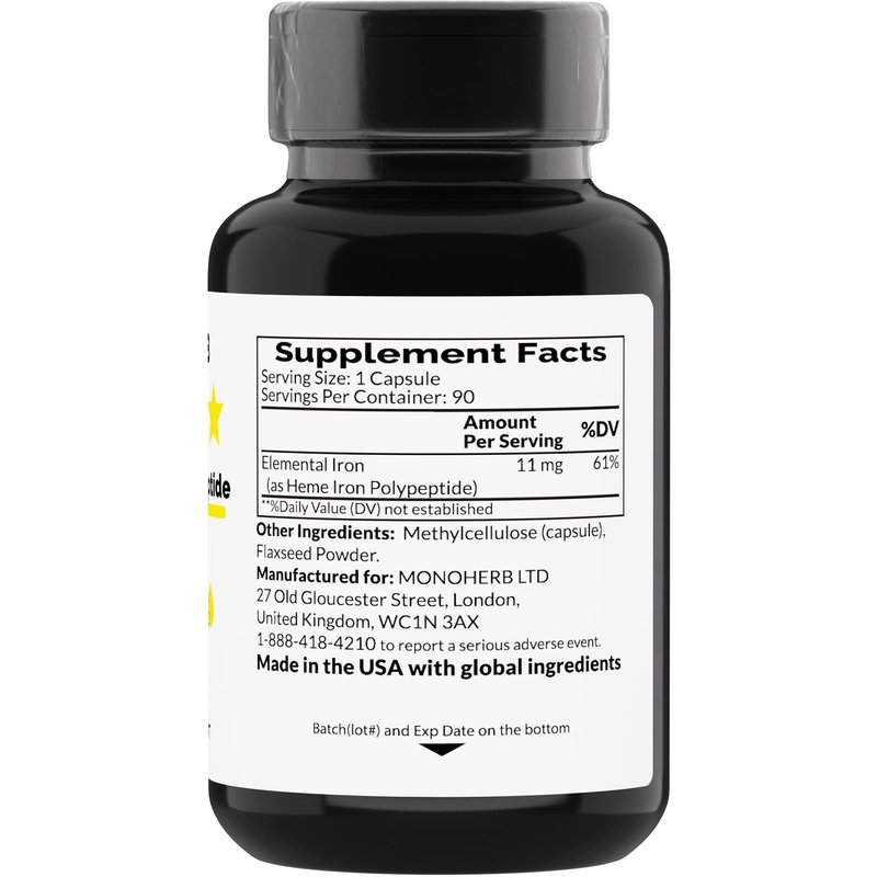 - Heme Iron Polypeptide, 90 SERVING: 90 vegetarian easy to swallow capsules (11 mg per capsule).