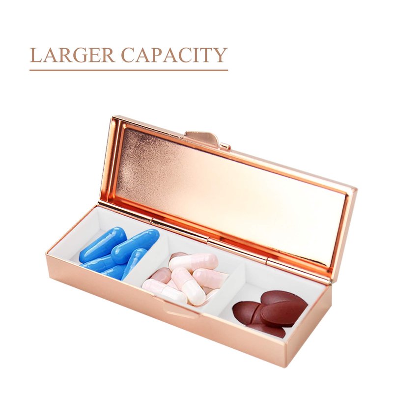 - Material: Stainless steel. Color: Rose Gold. Rectangle Pill Box Size: 3.34*1.18*0.59 inches
