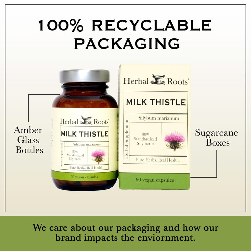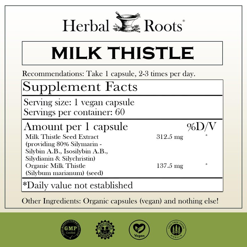 Herbal Roots Milk Thistle Capsules | Extra Strength 80% Silymarin Herbal Supplement | Made with Pure Organic Milk Thistle | Vegan and GMO Free