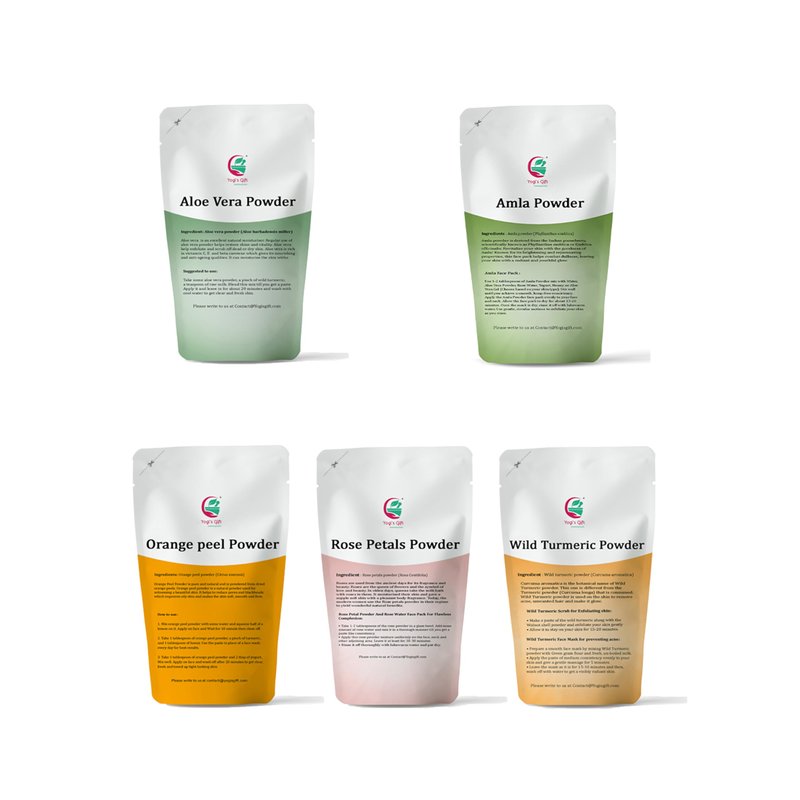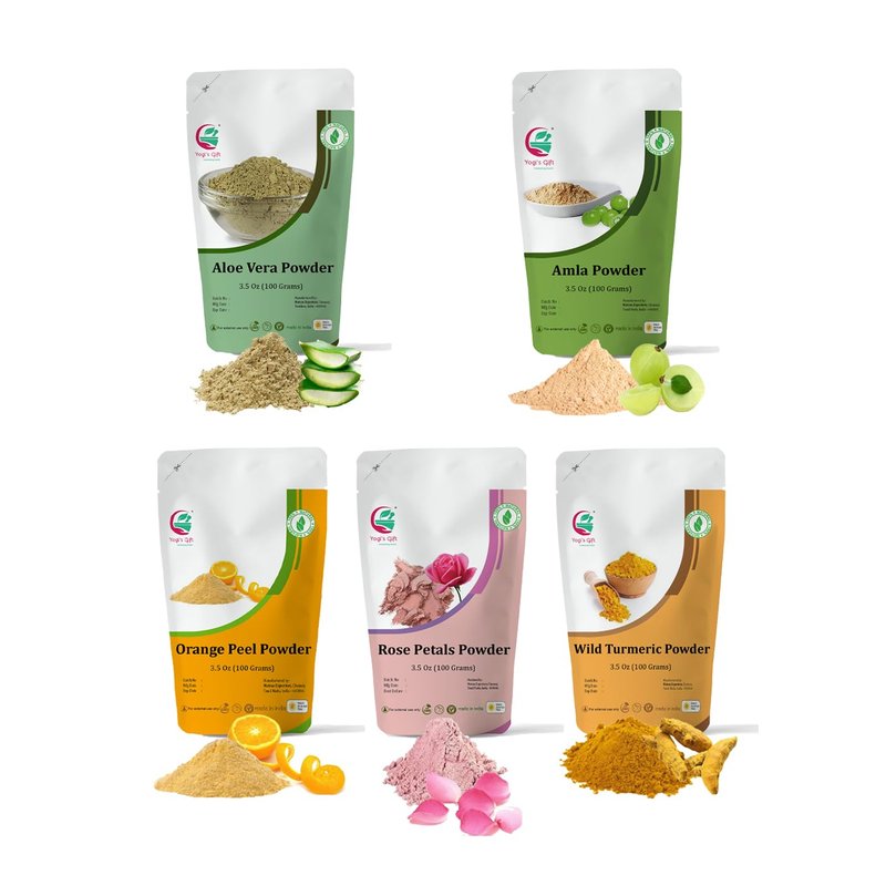 Herbal Skin Care Set | 5 powders in One Pack | Aloe vera, Amla, Orange Peel, Rose & Wild Turmeric powders | 100g Each | DIY Face Mask Powders | By Yogi's Gift®