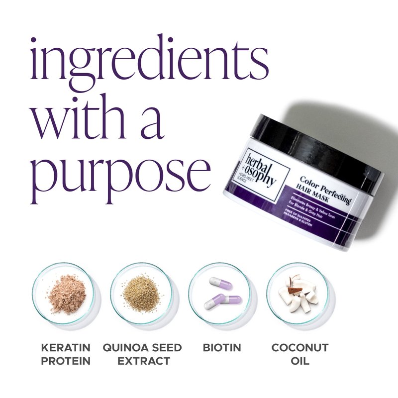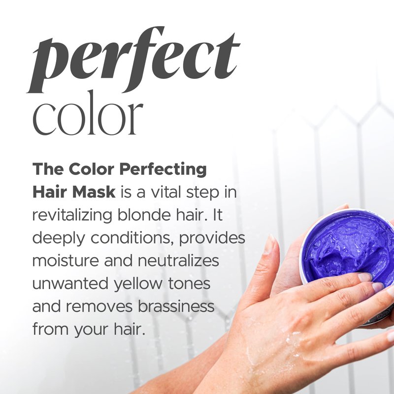 - COLOR PERFECTING HAIR MASK neutralizes unwanted brassy/yellow tones as it deeply moisturizes and conditions dry, damaged hair with an all-star cast of ingredients such as ProVitamin B7 Biotin, Collagen, Hydrolyzed Keratin, Coconut Oil And Quinoa Seed Extract