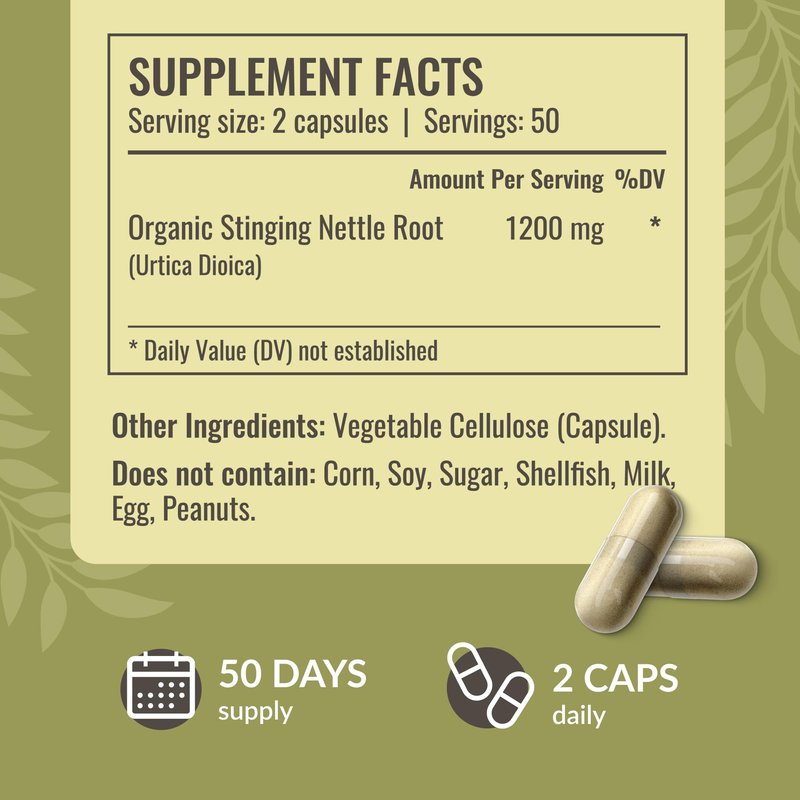 - Only Two Ingredients: Our Stinging nettle urinary supplement features a simple, plant-based formula with just two ingredients - Stinging nettle root and a vegetable cellulose capsule. Made vegetarian, with an easy-to-digest formula with no artificial additives.