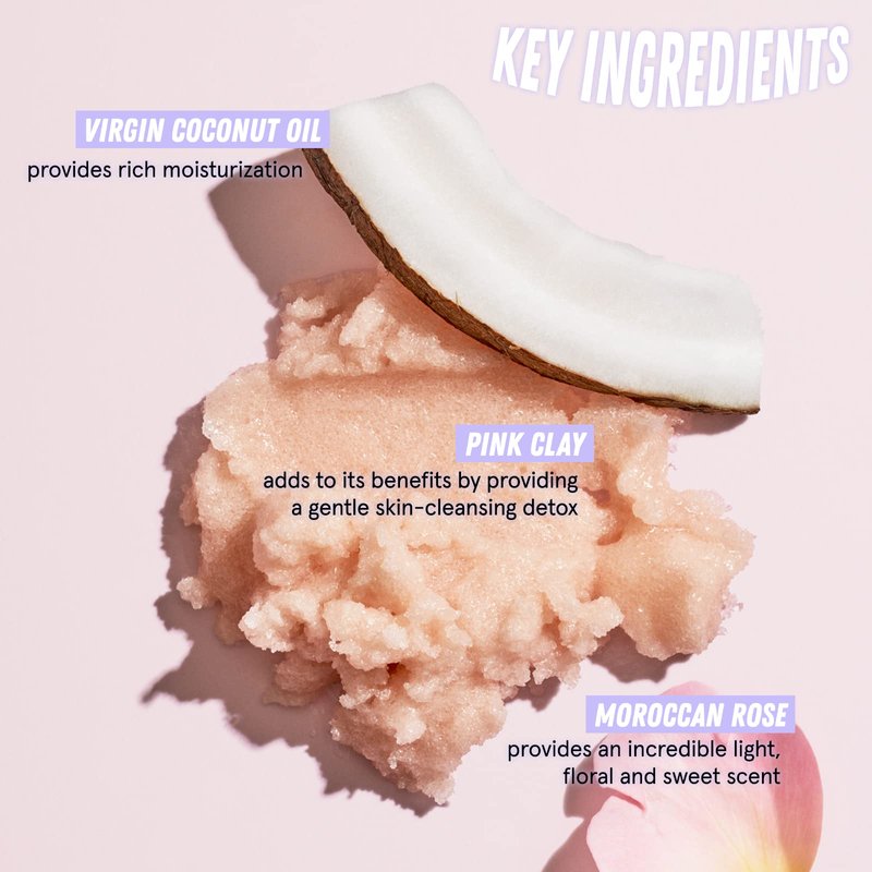 - TRULY NATURAL INGREDIENTS: Our body scrub utilizes coconut oil and shea butter for intense moisture while pink clay provides a cleansing detox and moroccan rose finishes with a light, sweet scent.