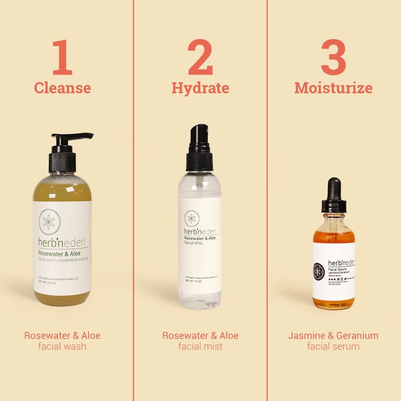 Herb’N Eden Dry Skin Facial Kit | Cleansing, Hydrating, and Moisturizing | 5 Product Set includes Wash, Mist, Serum, Body Butter, Sisal | 100% Natural Ingredients | Essential Oils