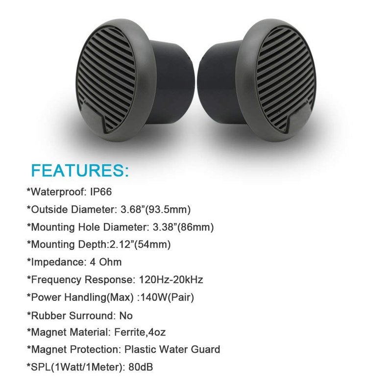 - Application Environment:Since it is a waterproof resistant speakers, our Motorcycle Boat speakers can use at Yacht, ATV, UTV, Golf Cart, Powersports, Motorcycle, Heavy duty vehicles, SPA, Hottub and more