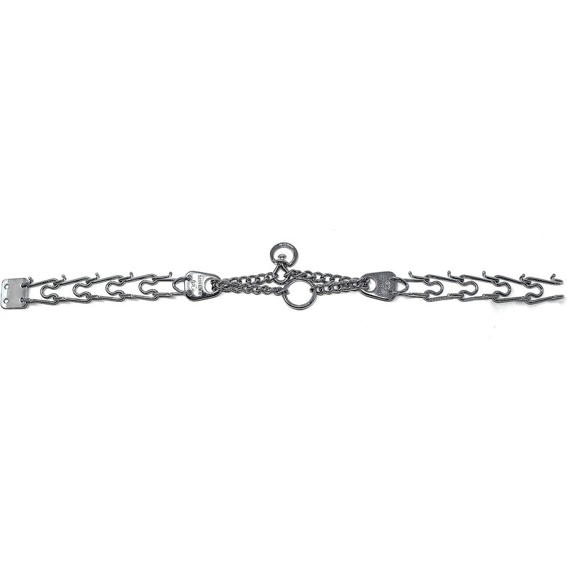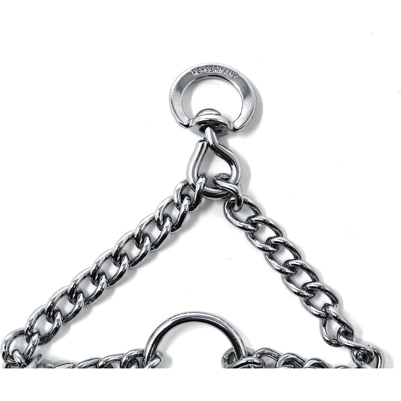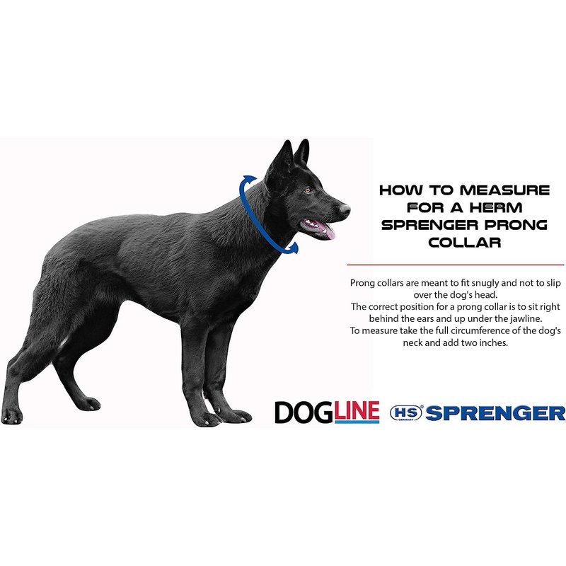 The Herm Sprenger Chrome Plated Steel Dog collar is one of the most recognizable and popular names in obedience training tools. A safe and effective alternative to choker collars, it puts even pressure around the neck, about every half inch, putting the skin in a band. This collar does not apply direct pressure to the trachea, so you can train your dog with little or no tugging, jerking, or pulling. The addition of a center plate connector allows the middle link to be configured symmetrically, enabling the links to tighten in the same direction. Made of high quality German steel, The size of this collar can be adjusted by adding or removing the links individually. Features: interlocking links, each link equipped with two blunt link tips slips over dog's head for easy on, easy off slightly beveled link tips easy to increase or decrease in size. Links sold separately. These collars come in four sizes Small 2.25mm x 16”, Medium 3mm x 22”, 3.2mm x 23” and 3.9mm x 25”. Sizing instructions: collar should fit snuggly just below the dog's ears, measure the circumference of dog's neck and add 2". Please note: NOT recommended for light color dogs.