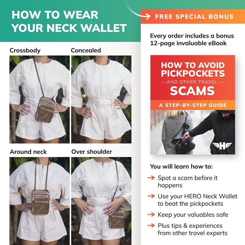 That’s why we custom designed the HERO Neck Wallet, an all-purpose passport holder for both men and women that stores credit cards, currency, tickets, and more; and protects them all from theft with discrete, hidden comfort and RFID blocking technology.