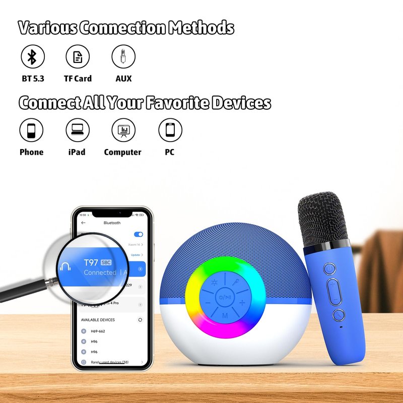 - Bluetooth 5.3:This karaoke machine makes getting the party started a breeze! The speaker and wireless microphone automatically pair when you switch them on - no complicated setup is needed. Just grab the mic and start singing. To connect your phone or computer, turn on the karaoke microphone's Bluetooth and select "T97" on your device. With the latest Bluetooth 5.3 technology, you can enjoy seamless streaming and a rock-solid connection up to 30 feet away