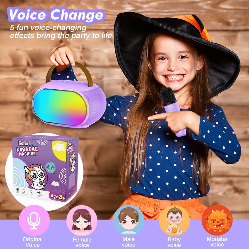 - 【Magic Voice & Dancing Light】: This Kid's karaoke machine also has an exciting magic sound design, which uses various interesting effects to change children's voices, such as woman voice, man voice, baby voice, monster voice, perfect for party entertainment. Its body also has a very cool lighting design, you can change the lighting effect as you like, and the colorful flashing lights can increase the fun of use. From karaoke nights to family gatherings, our versatile microphone is a must-have!