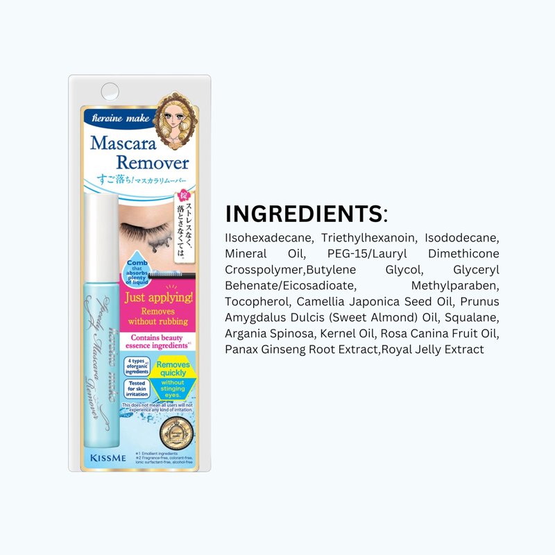 Heroine Make by KissMe Speedy Mascara Remover is designed to quickly and gently remove even the most stubborn waterproof mascara. With a fast-acting formula, this remover effortlessly dissolves long-lasting makeup while being gentle on the delicate eye area. The easy-to-use brush applicator ensures precise application, allowing you to coat lashes for an effective cleanse without the need for harsh rubbing. Perfect for everyday use, this mascara remover leaves your lashes clean, soft, and makeup-free without irritation or residue. INGREDIENTS: Isohexadecane, Triethylhexanoin,Isododecane, Mineral Oil, PEG-15/Lauryl Dimethicone Crosspolymer, Butylene Glycol,C30-45 Alkyl Methicone, C30-45 Olefin,Tocopherol, Propylparaben, Camellia Japonica Seed Oil, Prunus Amygdalus Dulcis (Sweet Almond) Oil, Squalane, Argania Spinosa Kernel Oil, Rosa Canina Fruit Oil, Panax Ginseng Root Extract, Royal Jelly Extract