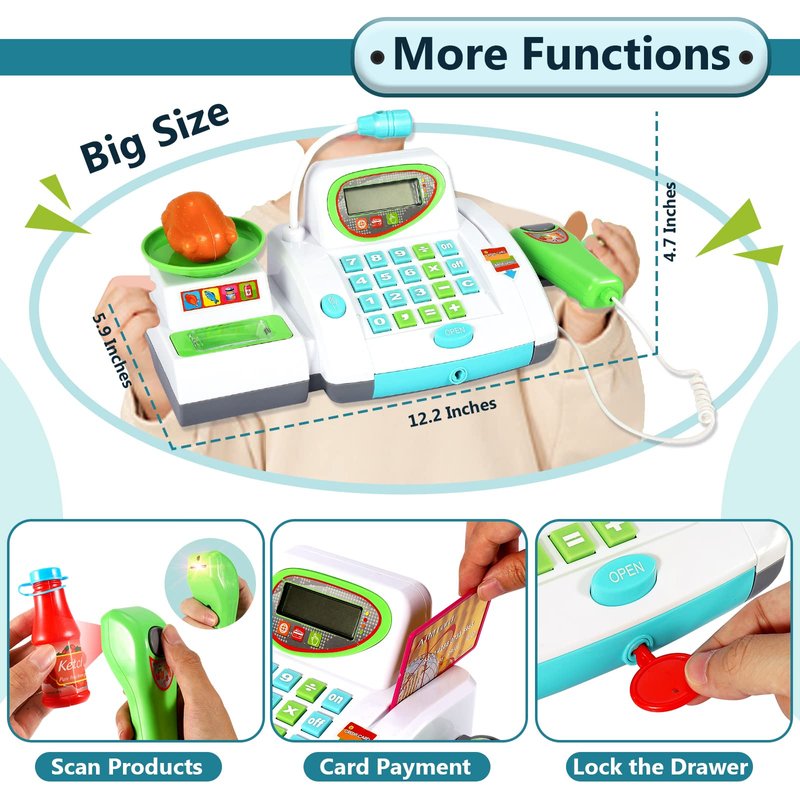 - 【Large Toy Cash Register】: 31*15*12cm. 3 x AA Batteries Required (Not Included).
