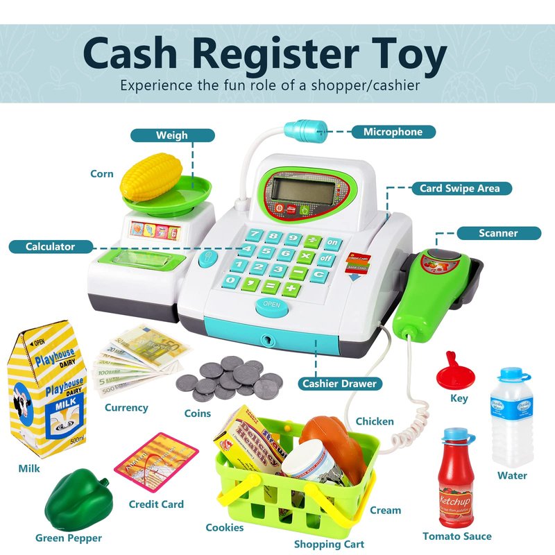 - 【Play Cash Register with Working Microphone】: Keep press the microphone button and exhale into the microphone, the microphone will emit sound.