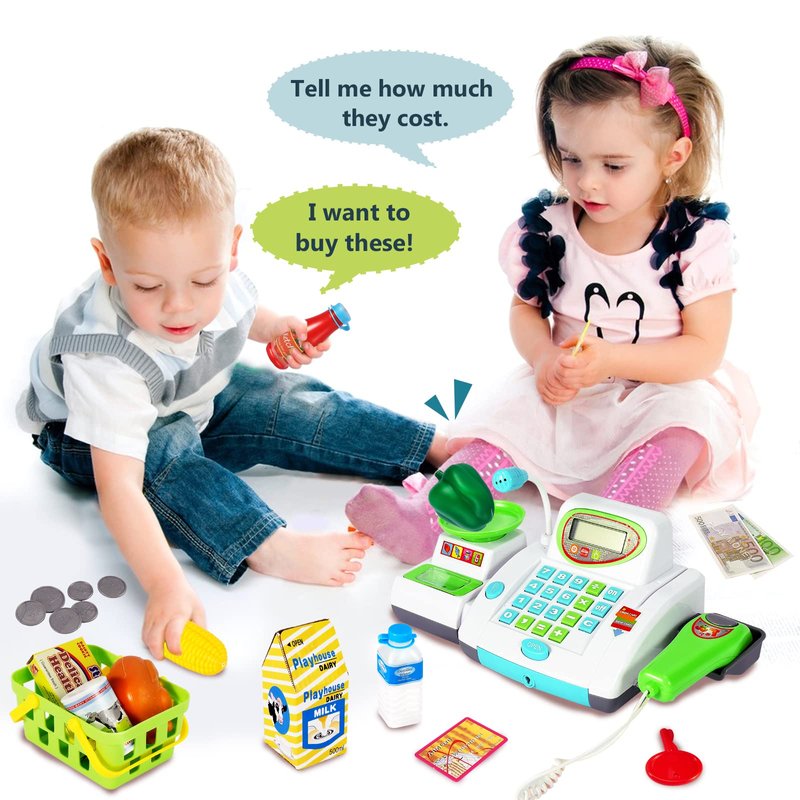 HERSITY Kids Toy Cash Register with Scanner and Microphone, Pretend Play Money Electronic Calculator Realistic Children's Supermarket Cashier Gifts for 3 4 5 Years Old Toddlers Boys Girls