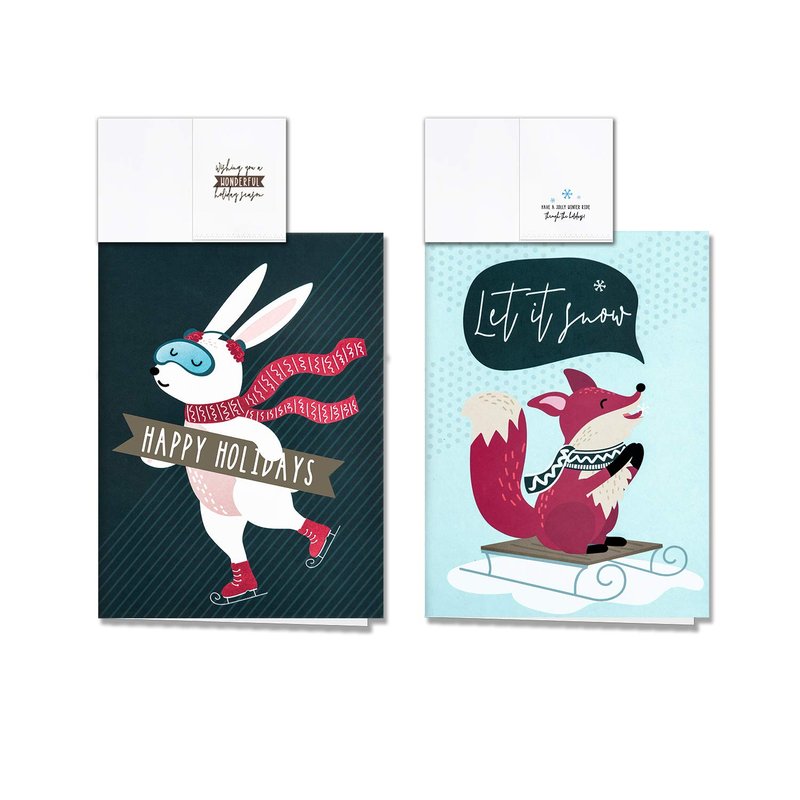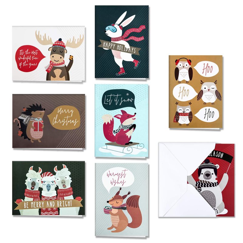 - UNIQUE AND FESTIVE. These fancy holiday cards feature stylish illustrations of cute animals that's sure to tug at the heart of the receiver and the giver. A mixture of sweet animals’ charm with the warm fuzzy feeling of Christmas. A worthwhile purchase for the holidays!