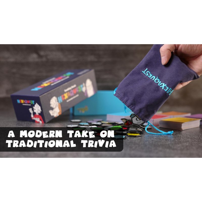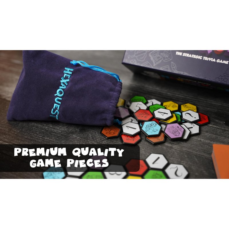 Discover Hexaquest, the ultimate strategic trivia board game designed for endless fun and learning. With 1500 multiple-choice questions across six varied trivia categories, this game offers something for everyone. Whether you're a dedicated gamer or a casual player, Hexaquest promises hours of entertainment. The game includes 65 high-quality hexagon playing tiles, which not only enhance the game's visual appeal but also add a tactile element that players will love. These tiles are complemented by a luxury embroidered drawstring bag, perfect for convenient storage and adding a touch of sophistication to your game collection. One of the standout features of Hexaquest is its simplicity. You can learn the rules and start playing in just 60 seconds, making it ideal for impromptu game nights and easy to teach to new players. This quick setup ensures that the fun can start almost immediately, without the hassle of lengthy rule explanations.
