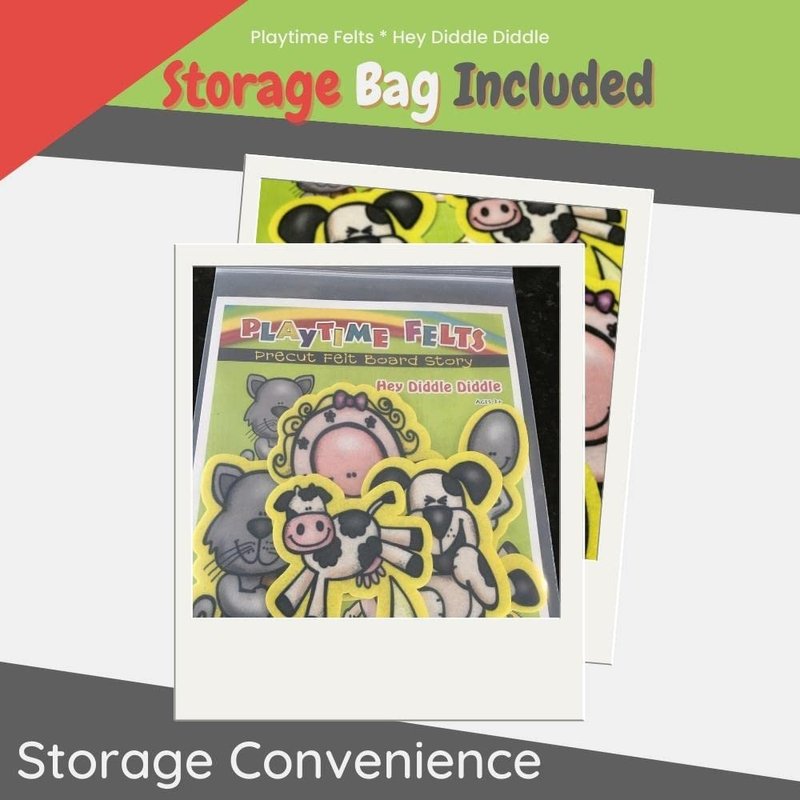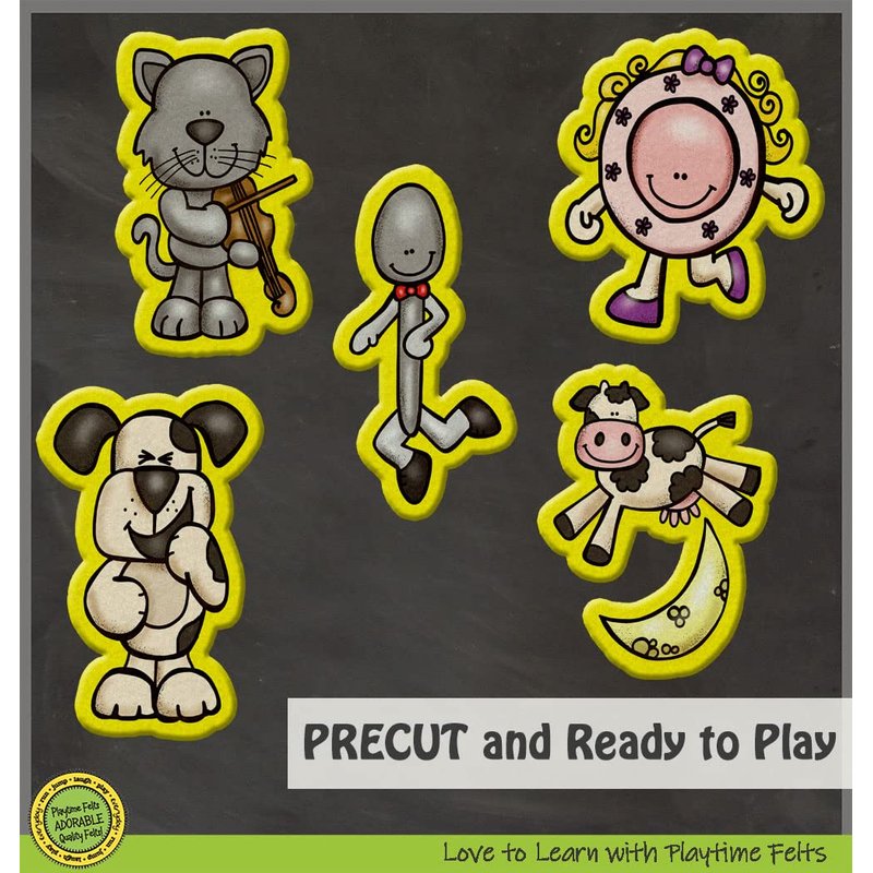 - FELT SET INCLUDES: 5 DURABLE Felt Images - Cat and Fiddle, Cow and the Moon, Laughing Dog, Dish and Spoon. Plus Story Script and Convenient Storage Bag.