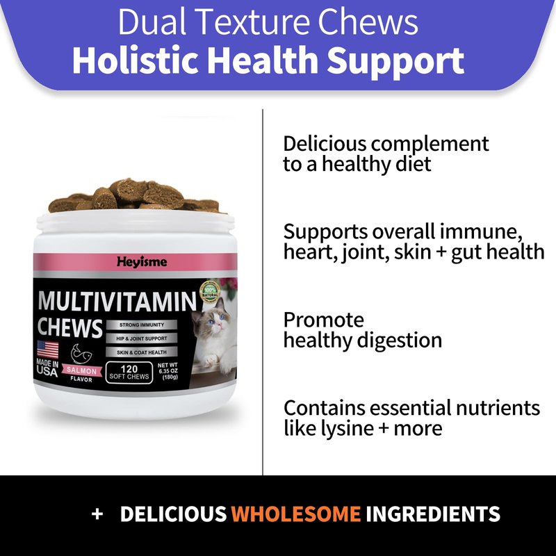 - Complete Cat Health Enhancer: Presenting HEYISME scientifically crafted and veterinarian-approved lysine for cats and multivitamin Cat Treats - a comprehensive approach to your cat's well-being. Made in USA, reliable and suitable for cats of all ages, it's the go-to supplement for pet guardians around the world.