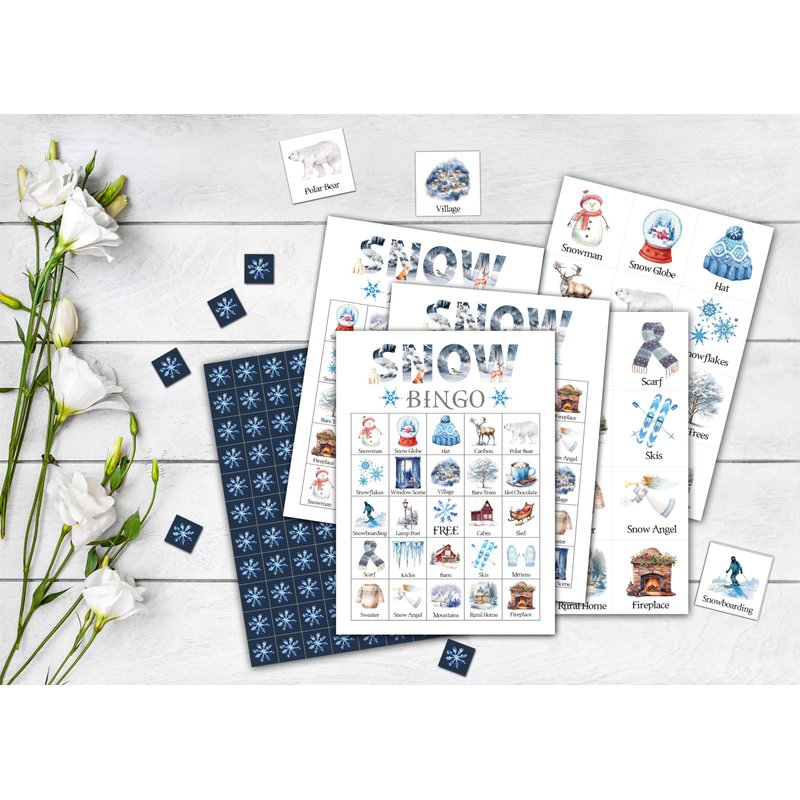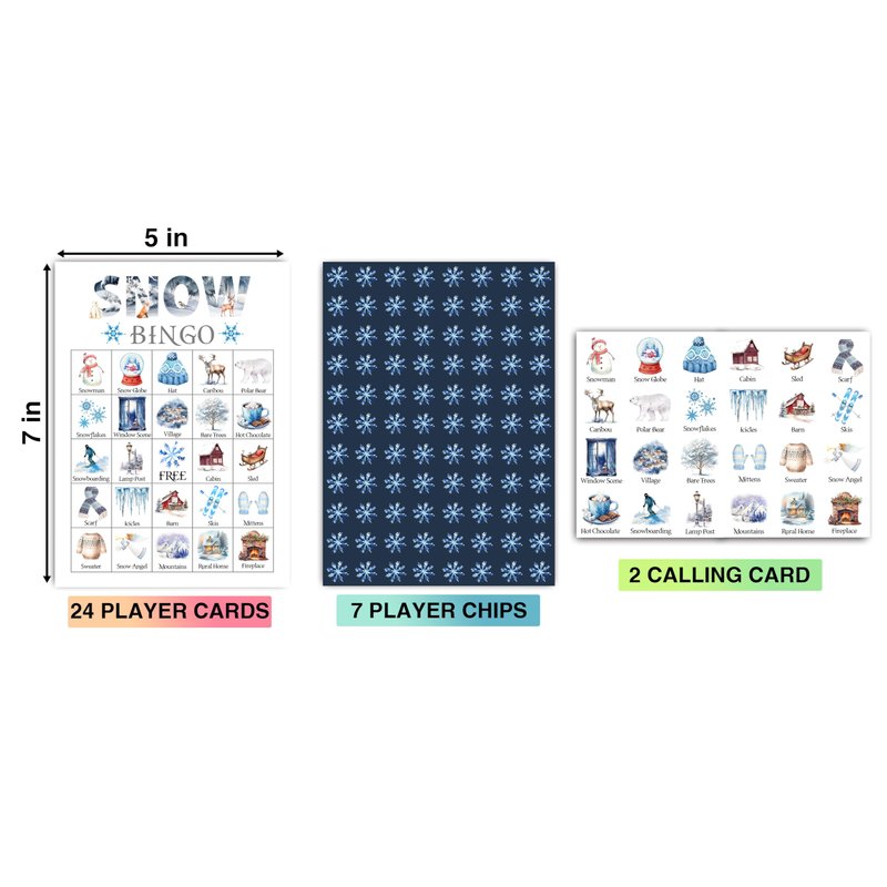 Exquisite Design: The snow themed bingo game cards are printed with a variety of exquisite and cute patterns, including snowman, scarf, barn, skis, fireplace, sweater, bare trees and so on.