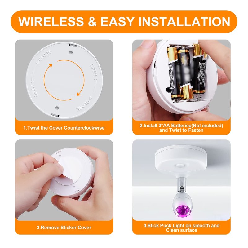 - Simple Installation --Our stick on spotlights can be easily installed in 2 ways, double-sided tape or screws, you could stick it onto any smooth surface indoor. With adhesive, please keep the surface be clean and dry before installation, press and hold for a few seconds after installation to strengthen the adhesive. If the surface is rough or wet, pls use screws to achieve firm installation