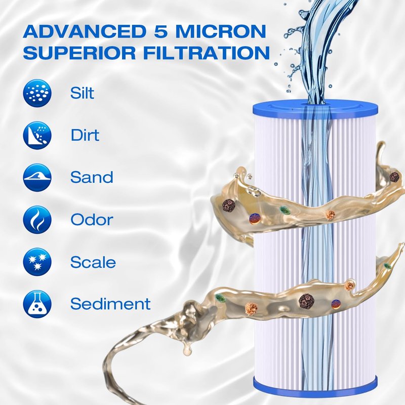 This 2-pack 4.5" x 10" Pleated Water Filter is designed for whole house filtration systems. Featuring a 5-micron filtration rating, it effectively captures sediment, rust, sand, silt, and other suspended particles, helping extend the lifespan of your plumbing and appliances. Made with durable, high-capacity pleated polyester, each cartridge provides a larger surface area for longer service life and higher flow rates. The filters are washable and reusable, reducing maintenance costs and ensuring steady water pressure throughout your home.