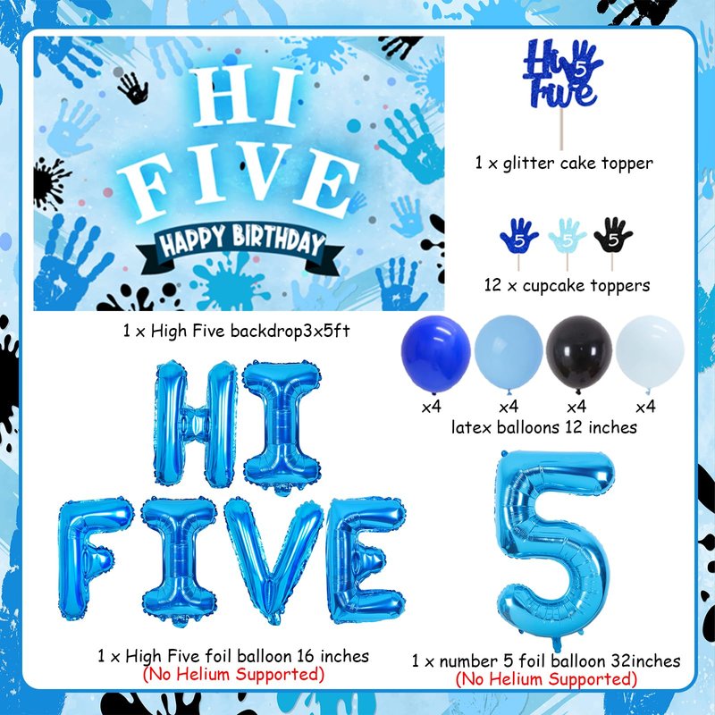 5th Birthday Party Decorations Boy Includes: 1 x High Five backdrop 1 x glitter cake topper 12 x cupcake toppers 16 x latex balloon 12 inches(4 black, 4 blue, 4 light blue, 4 ocean blue) 1 x High Five foil balloon 16 inches(NO Helium Supported) 1 x number 5 foil balloon 32inches(NO Helium Supported)