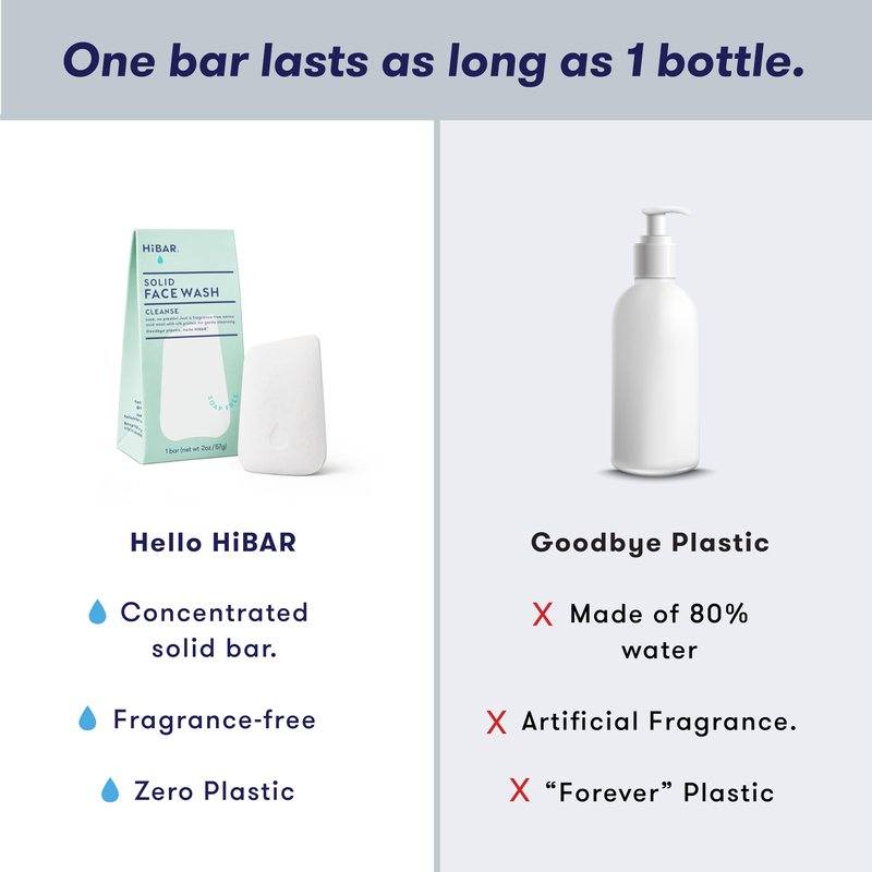 HiBAR's Cleanse Face Wash is a gentle face cleanser that goes beyond the basic duties of a cleanser face wash. The pH balanced, concentrated, and waterless formula of this face wash sensitive skin bar provides an effective solution for those with oily skin, while also serving as a hydrating face wash for those in need of added moisture.