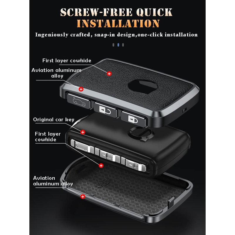 - Material : The smart car key cover case made of premium Aluminum alloy.The outer frame made of aluminum alloy and the leather layer made of the top layer leather.The hard aluminum alloy frame can well protect your car keys from falling and scratches, and the surface has a leather texture, which can bring you an excellent touch experience.