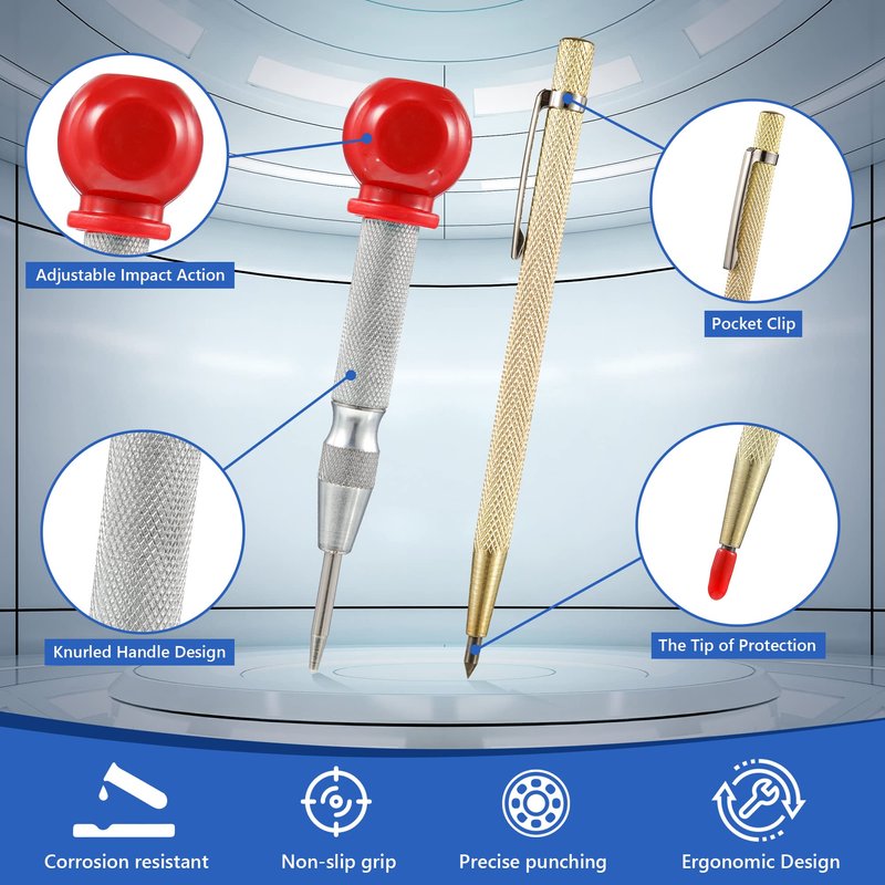 - Practical center punch tool: the automatic center punch is made of chrome plated steel body, have high impact resistance and wear resistance; The red cap on the top can give you a good grip while you apply pressure, unscrewing it can adjust the force of impact; A deep knurled finger grip for easy handling and better control with one hand; Makes center punching a breeze; This center metal punch great for wood, plastic, metal, glass, and leather