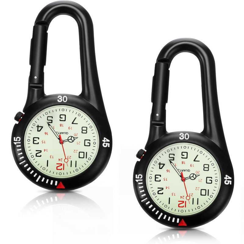 Hicarer 2 Pieces Clip on Quartz Watch Backpack Fob Belt Watch Glow in The Dark Unisex Pocket Watch with White Dial for Doctors Nurses Outdoor Activities (Black)