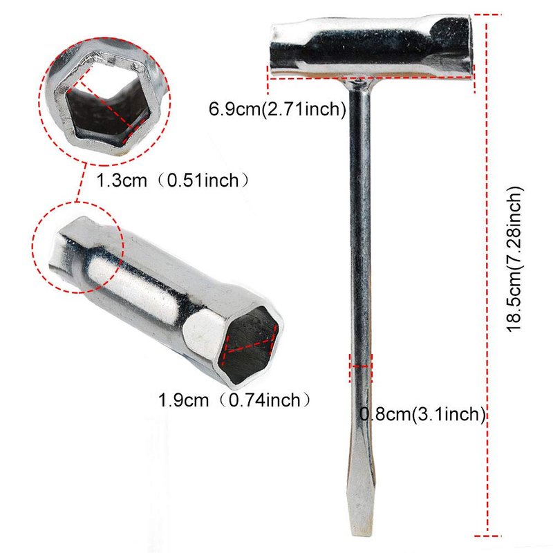 - 1.Combination Screwdriver And Wrench, Wrench Sizes 13mm x 19mm, Length:7.28inch, Thickness: 2mm. This chainsaw T wrench is made of high-quality steel, with a tight screwdriver end, high strength, high hardness, sturdy and durable, not easily deformed, ensuring long-term use.