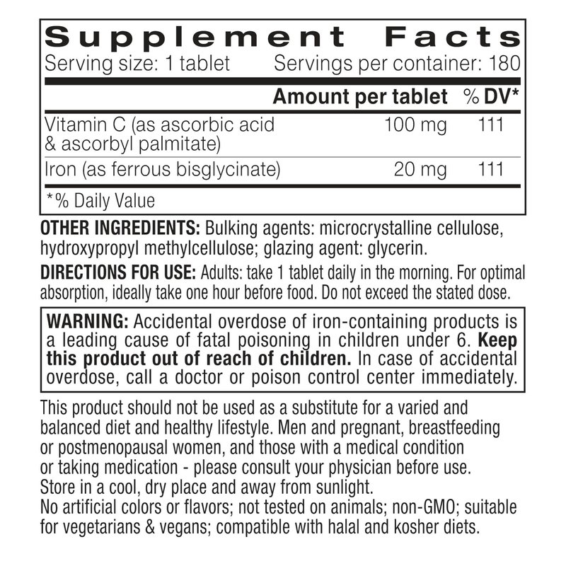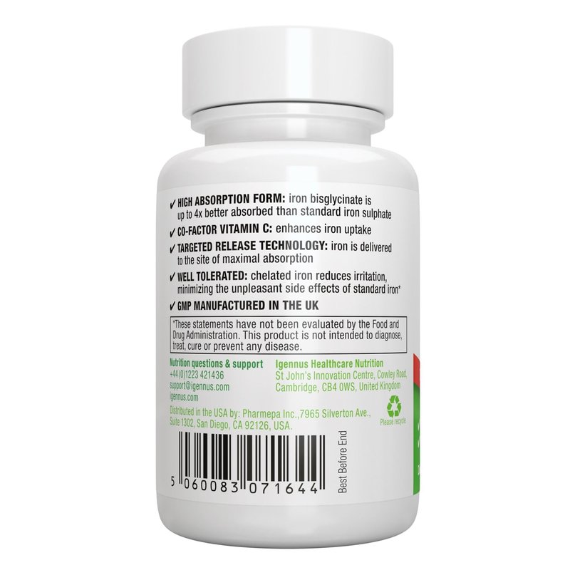 High Absorption Chelated Iron Bisglycinate 20mg with Vitamin C, Non Constipating Gentle Iron, 180 Tablets, Targeted Release, One Daily, Vegan, by Igennus