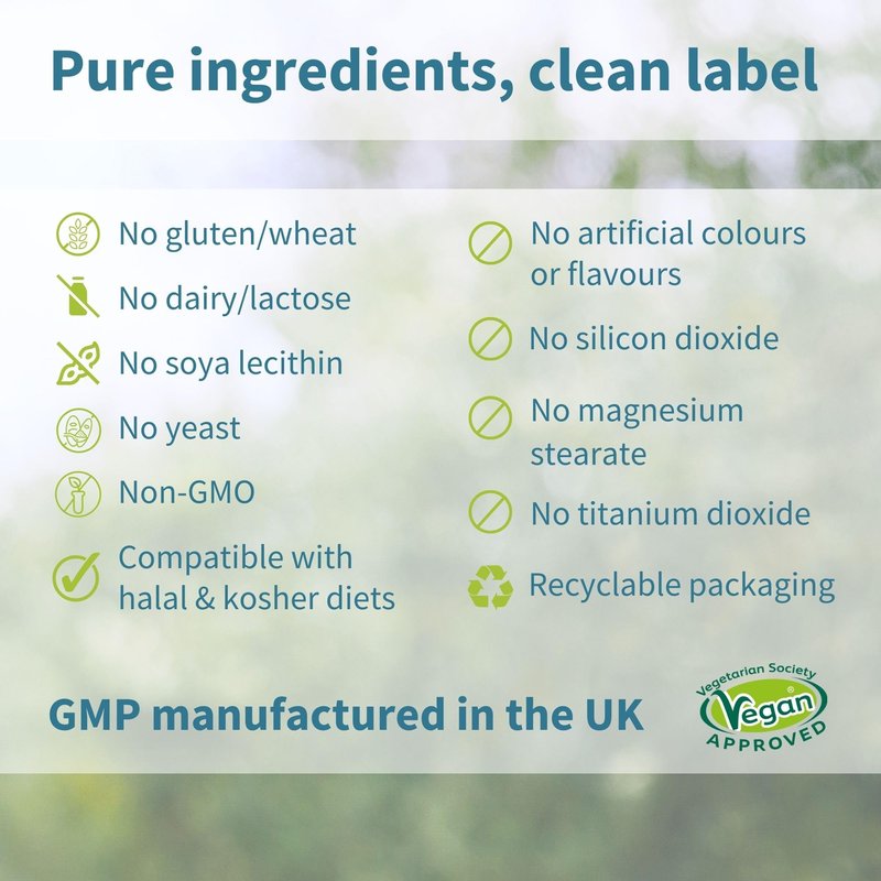 - PURE & CLEAN: vegan, non-GMO, hypoallergenic ingredients with no unpleasant fillers (silicon dioxide, magnesium stearate or titanium dioxide). Lab verified, GMP manufactured in the UK