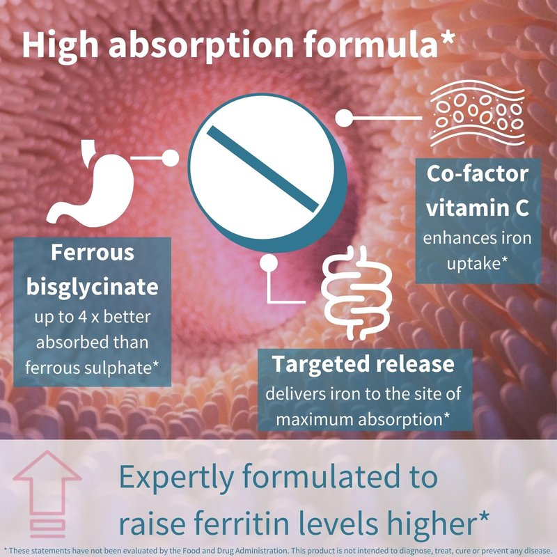 - HIGH ABSORPTION - chelated iron bisglycinate is absorbed up to 4x better than ferrous sulphate. Targeted release technology delivers iron directly to the small intestine