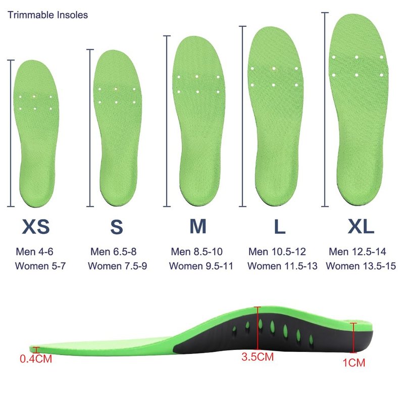 - High Arch support-If you are suffer from plantar fasciitis,flat feet,fallen arch&low arch or high arch, then you will need a lot of arch support. Our insoles provide 1.38 inches arch support for high arch, and give a firm and supportive arch for plantar fasciitis,flat feet,fallen arch&low arch. It fits right up into your arch like a good chair against your lower back-Instant pain relief.