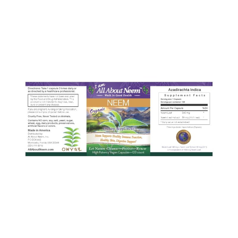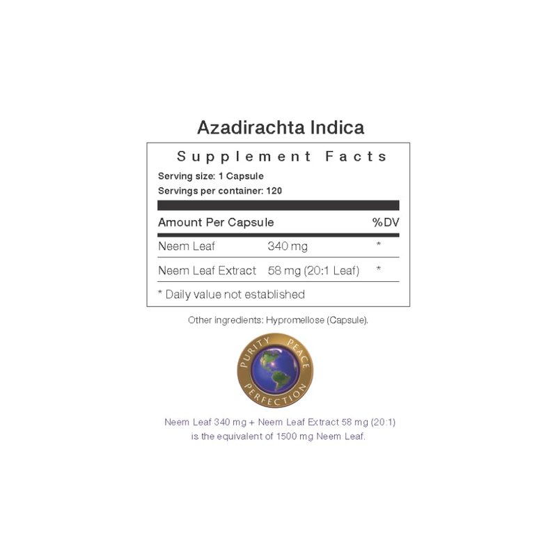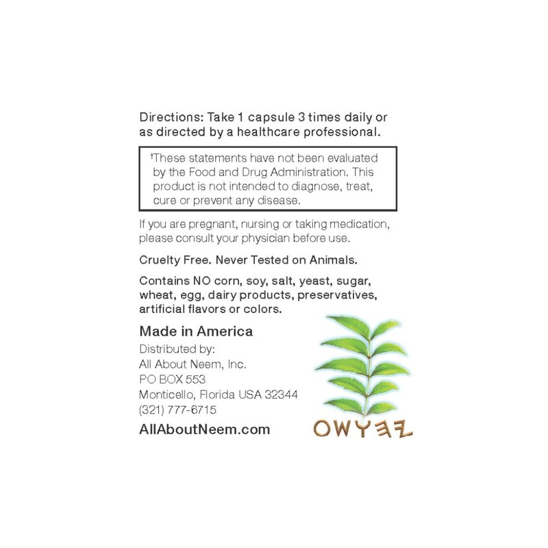 Made in the USA. Produced in the USA in a registered FDA compliant Facility. Minority owned, small business company. Directions: Take one to three capsules daily with a meal or as directed by your healthcare provider. All Natural Ingredients Azadirachta indica (neem) Leaf Azadirachta indica (neem) Extract Hypromellose (capsule) Vegetarian Capsules. Cruelty Free. Never been tested on animals. PREMIUM QUALITY : Our product is 100% PURE, FRESH, NON GMO, RAW, VEGAN, GLUTEN-FREE, ORGANIC, KOSHER, AYURVEDA QUALITY, ADDITIVE FREE, WHEAT FREE, CORN FREE, SOY FREE and DAIRY FREE.Contains NO corn, soy, salt, sugar, wheat, egg, dairy products, preservatives, artificial flavors or colors. *The presence of the Neem extract significantly increases the potency of this product. FDA Disclaimer: These statements have not been evaluated by the Food and Drug Administration. This product is not intended to diagnose, treat, cure, or prevent any disease. Minority Owned business.