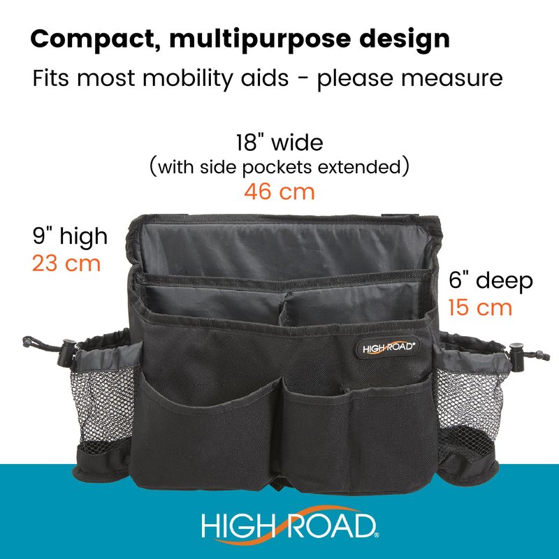 High Road Walker Bag, Wheelchair Caddy and Mobility Scooter Pouch with Cup Holders, Easy Access Pockets and Secure Buckled Straps