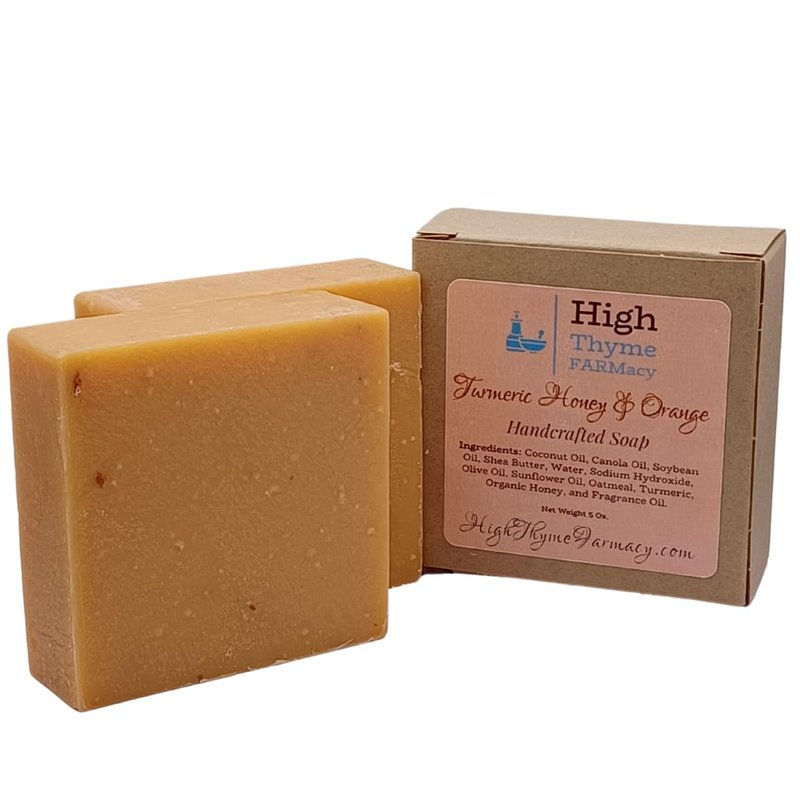 - High Thyme FARMacy's Turmeric Honey & Orange Soap features an aromatic blend of turmeric, honey & orange with a hint of spicy ginger. Our natural bar soap is a perfect addition to your daily routine.