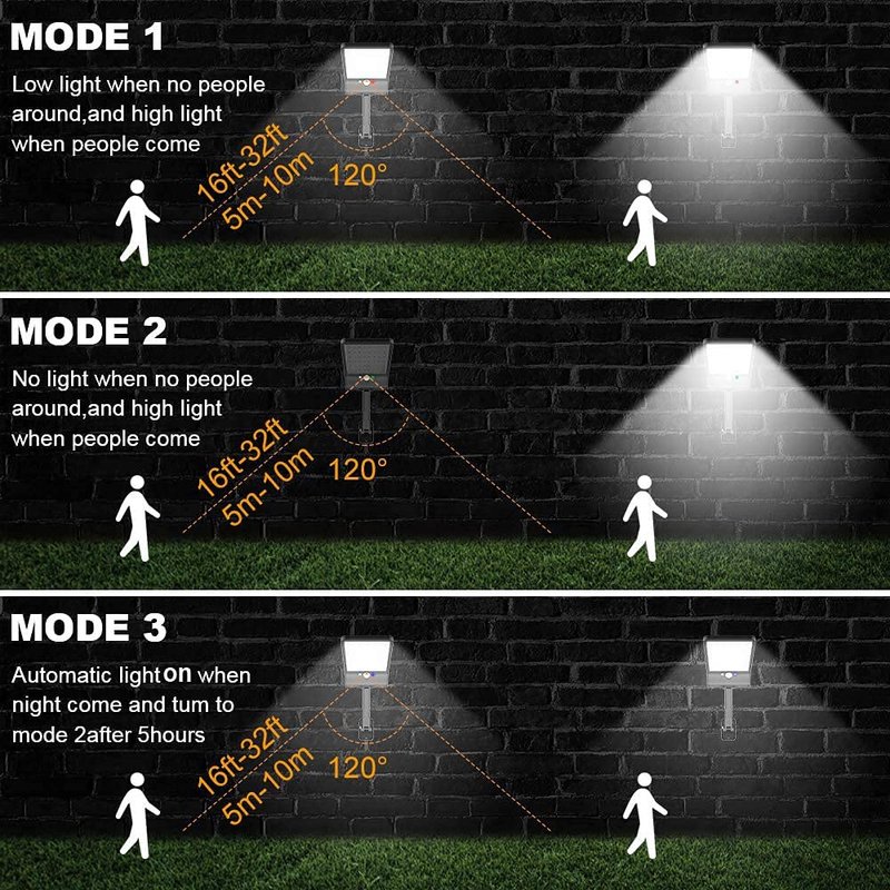 *Mode 1: 1/2 Brightness Light+ Motion Sensor Full Brightness Light When in dark night, the light will keep 1/2 brightness without people coming near, however become bright if people comes.