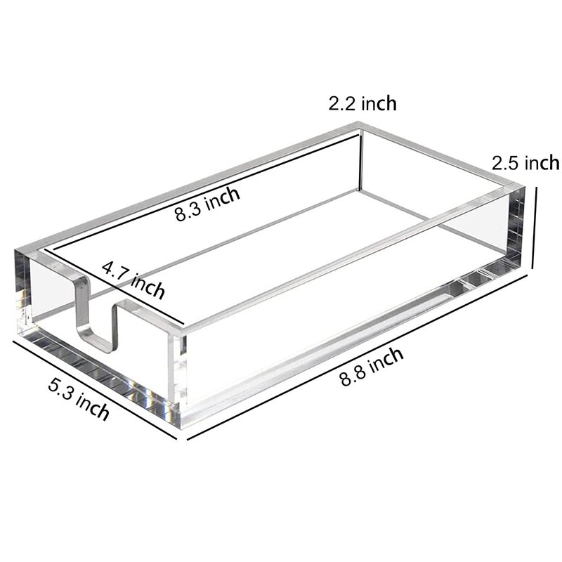 Our acrylic towel holder is an ideal gift for various occasions such as birthdays, Mother's Day, Father's Day, Thanksgiving, Christmas, and more. The napkin holder has an outer diameter of 8.8 x 5.3 x 2.5 inches and an inner diameter of 8.3 x 4.7 x 2.2 inches, fits standard 8.3 x 4.7 inch guest towel/napkins or smaller, it can hold a generous amount of napkins while keeping them clean and organized. Order yours today and add a touch of elegance to your home or office!