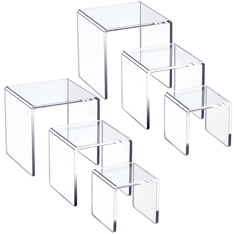 - PACKAGE INCLUDES- 2 set of 3-tier acrylic display risers, 6 packs in total. 3x3x3, 4x4x4 and 5x5x5 inch cubic acrylic riser shelf is also great for showing jewelry, makeup, perfume and watch etc. You will like the multipack with various sizes, which makes the display more interesting to look at and the favorite items are easier to access.