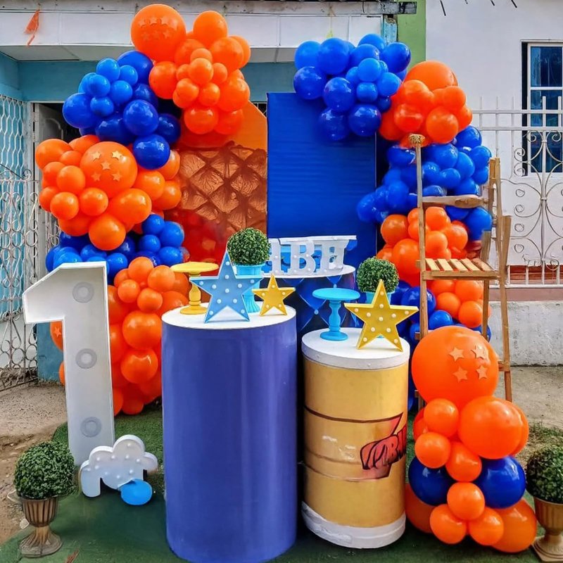 - Black Orange Blue Balloons Garland Arch Kit: Includes matte black balloon(18 in, 1 pc; 12 in 10 pcs; 5 in, 15 pcs), royal blue balloons (18 in, 1 pc; 10 in 10 pcs; 5 in 15 pcs), metallic blue latex balloon(10 in, 10 pcs; 5 in, 15 pcs), orange helium balloon (10 in, 20 pcs; 5 in, 15 pcs)