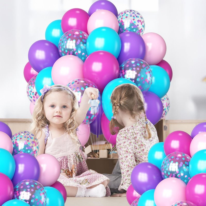 - Light Pink Purple Blue Balloons: Includes hot pink balloons (12 in; 15 pcs ); turquoise balloons (12 in; 15 pcs ); pastel pink balloons (12 in; 10 pcs ); matte purple balloon (12 in; 10 pcs ); confetti helium balloons (12 in; 10 pcs ) and a roll white ribbon; This balloons teal lavender purple pink can add a unique atmosphere to your end of birthday decorations